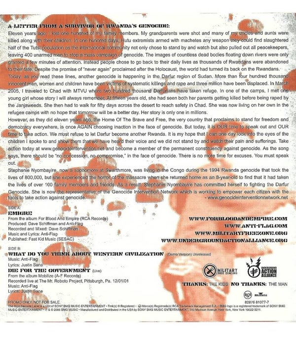 Anti-Flag - Emigre (PROMO) b/w What Do You Think About Western Civilization + 3 Track (7") 45 RPM Vinyl Record